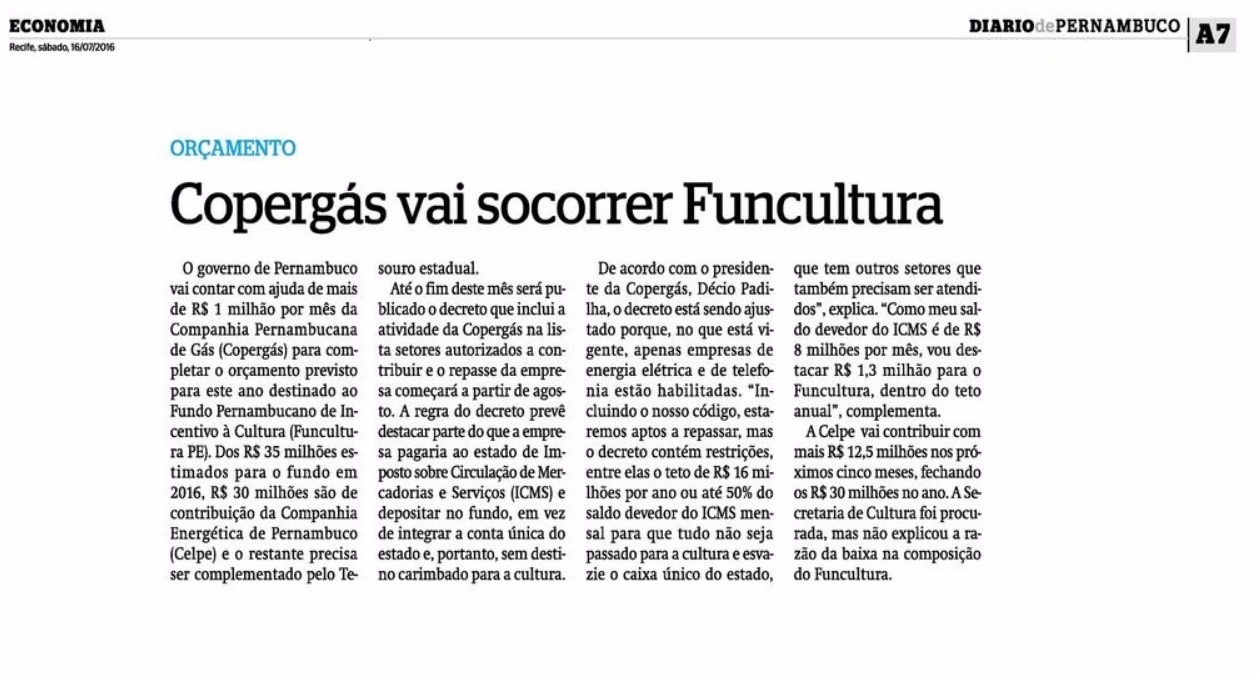Copergás vai socorrer Funcultura Publicada em 16/07/2016 17:46 - Atualizada 11/02/2023 17:45 Compartilhe: