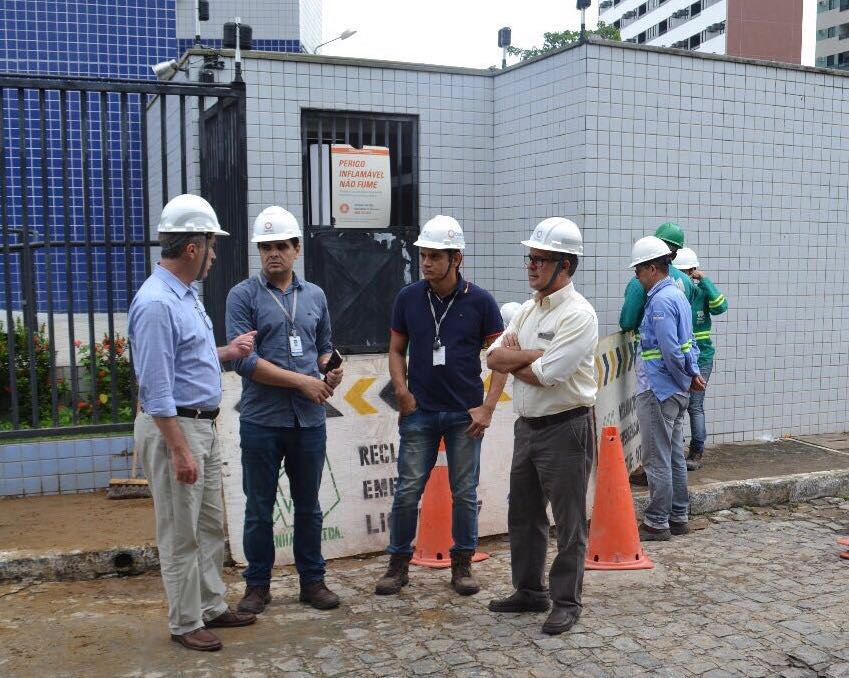 Os diretores José Waldir Ferrari, Técnico Comercial, e Luciano Guimarães, Administrativo Financeiro, realizaram visita, durante esta sexta-feira (19),  às obras de expansão do gás natural na Zona Norte do Recife. Acompanhados do gerente de Comercialização do Residencial e Comercial, Anderson Andrade, e do gestor de operações da Gerência de Distribuição, Clebson Campelo, o grupo  acompanhou às interligações de novos prédios residenciais e de futuros estabelecimentos comerciais que serão  abastecidos a gás natural nos próximos dias, entre eles o Restaurante Papa Capim, nas Graças, e Hospital da Restauração, no Derby. Na foto, eles observam a instalação do gás natural no Edifício Praça dos Girassóis, com 30 unidades residenciais, no bairro da Torre.