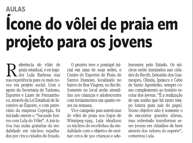 Ícone do vôlei de praia em projeto para os jovens Publicada em 08/03/2018 13:54 - Atualizada 11/02/2023 16:33 JORNAL DO COMMERCIO – 08/03/18 – ESPORTES – PAG.4 Compartilhe: