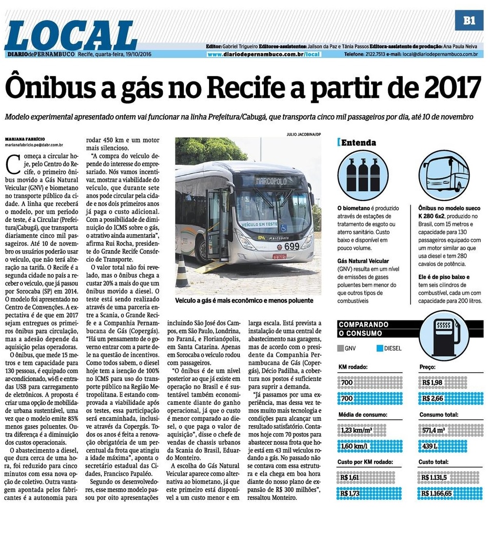 Ônibus a gás no Recife a partir de 2017 Publicada em 19/10/2016 18:27 - Atualizada 11/02/2023 17:35 Compartilhe: