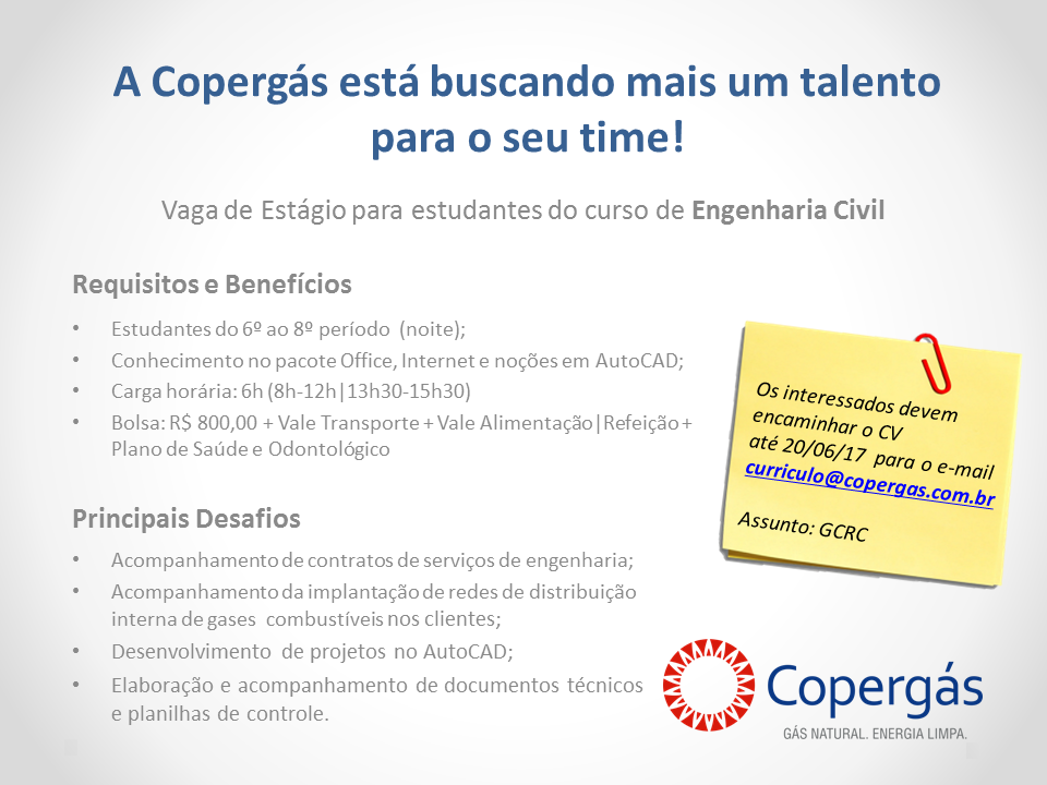 Oportunidade para estudantes de Engenharia Civil Publicada em 12/06/2017 16:51 - Atualizada 11/02/2023 16:48 Compartilhe: