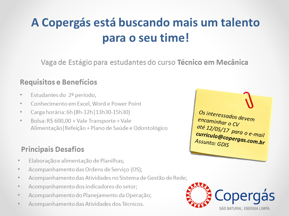 Vaga para estudantes de curso técnico Publicada em 04/05/2017 9:59 - Atualizada 11/02/2023 17:28 Compartilhe:
